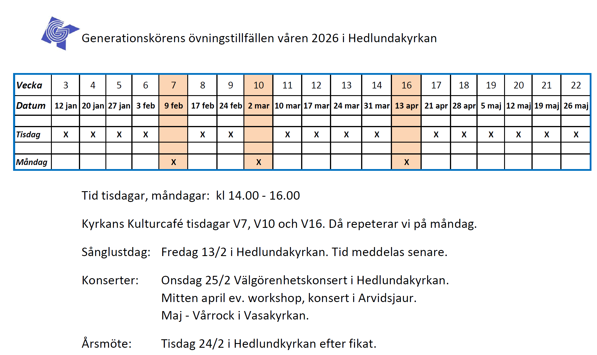 Nu har vi förlängt kontraktet med Hedlundakyrkan vilket vi är glada för. Som meddelades vid förra repetitionstillfället behövde vi se över rutinerna för städning av lokalen. För att slippa kostnad för städning gäller följande från och med nästa repetition: